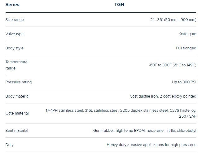KREBS Technequip TGH / HP Knife Gate Valves are designed for premium performance with massive, replaceable rubber sleeves to seal and withstand the harsh conditions in mining processes.The TGH / TGHP Valve is one of very few in the market that has been specifically designed for your most demanding applications. Due to the unique design of the valve, there is no need for a packing gland which reduces maintenance time and eliminates associated actuation issues caused by slurry build-up and dewatering in and around the packing gland. It also allows the gate to eject material out of the bottom during actuation, so you can be sure of full gate closure and a reliable seal. The gate is fully out of the pipeline when open. This minimizes pressure drop across the valve