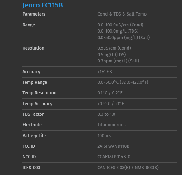 Jenco Cond/Salt/Tds/Temperature Tester EC115B