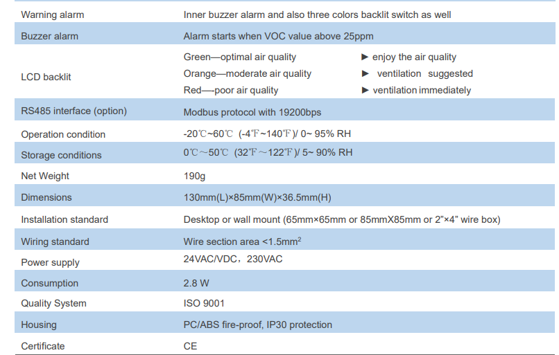 | LCD backlit | Three-color (green/orange/red) indicating air quality at optimal/moderate/poor |