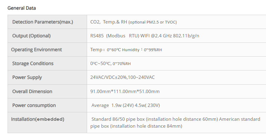 | Detection Parameters(max.) | CO2 Temp.& RH TVOC |