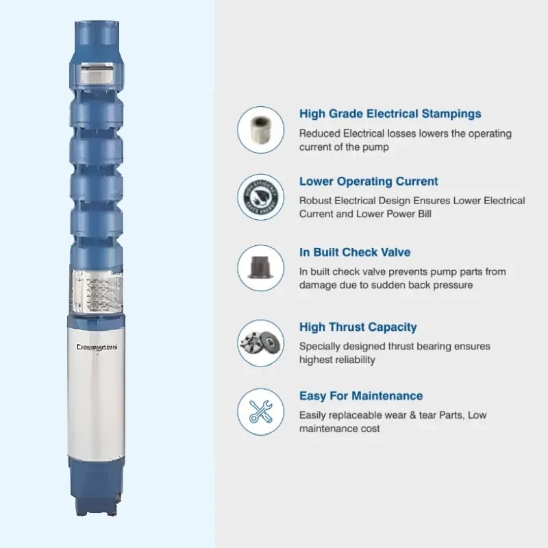 Crompton 125W75AK7.5DTP-38 7.5 HP Three Phase Submersible pump series. This pump is engineered with state-of-the-art technology, ensuring durability and efficiency in water management. Its robust construction features advanced thermal protection and superior anti-corrosion capabilities, ready to tackle the most challenging conditions. Equipped with exceptional suction power, this pump is perfectly suited for both residential and agricultural uses. It smoothly handles voltage fluctuations, maintaining consistent performance with minimal maintenance requirements thanks to its innovative anti-jam technology. The Crompton 125W75AK7.5DTP-38 sets a new standard in the industry, combining powerful performance with reliability, making it the ideal choice for anyone seeking an effective water management solution. Available on EnvMart, these Industrial Pumps are manufactured using premium materials and advanced techniques to meet high industry standards. Crompton Pumps are renowned for their reliability and quality, making this pump an excellent option for both residential and industrial applications. Explore the full range of high-quality Crompton Pumps and find the perfect solution for your needs.