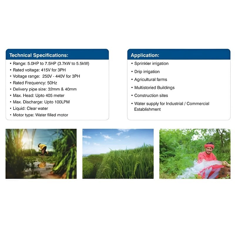 Crompton 5CSSF5-7530(3PH) 7.5 HP Three Phase Submersible pump series. This pump is engineered with state-of-the-art technology, ensuring durability and efficiency in water management. Its robust construction features advanced thermal protection and superior anti-corrosion capabilities, ready to tackle the most challenging conditions. Equipped with exceptional suction power, this pump is perfectly suited for both residential and agricultural uses. It smoothly handles voltage fluctuations, maintaining consistent performance with minimal maintenance requirements thanks to its innovative anti-jam technology. The Crompton 5CSSF5-7530(3PH) sets a new standard in the industry, combining powerful performance with reliability, making it the ideal choice for anyone seeking an effective water management solution. Available on EnvMart, these Industrial Pumps are manufactured using premium materials and advanced techniques to meet high industry standards. Crompton Pumps are renowned for their reliability and quality, making this pump an excellent option for both residential and industrial applications. Explore the full range of high-quality Crompton Pumps and find the perfect solution for your needs.