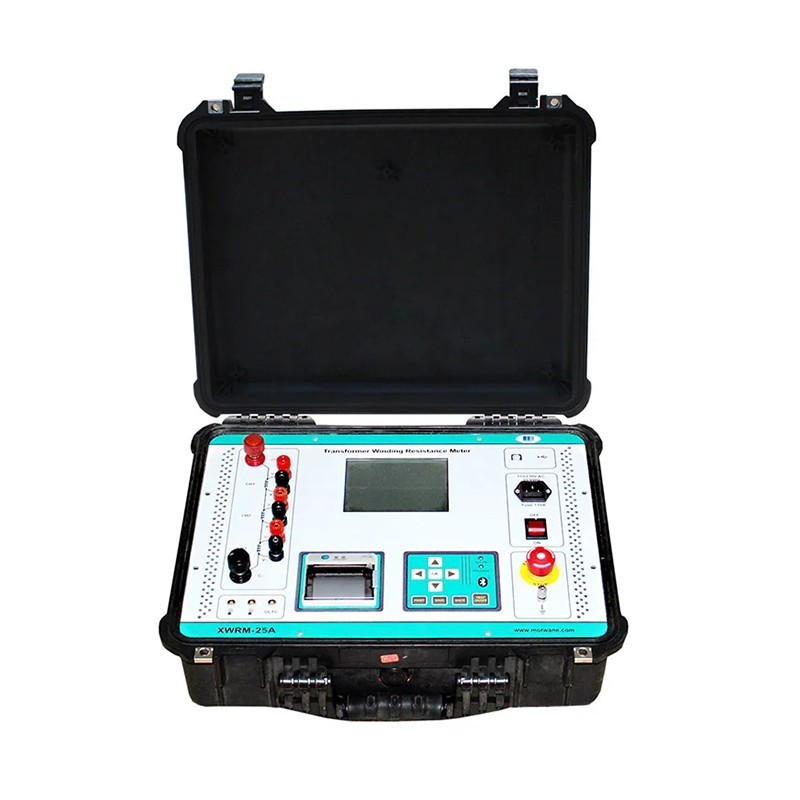 XWRM-25A transformer winding resistance meter is designed for accurate & fast measurement of the highly inductive loads such as transformers, reactors, generators, HT motors, etc. The selectable smooth DC test current is useful to test transformers with different power ratings. The higher open-circuit voltage feature saturates the core quickly to get stable readings. The three resistance measurement channels are used for the simultaneous measurement of the three windings to reduce the testing time. The heat run test feature can be availed with the software for a graphical representation. It also has a demagnetization facility, which eliminates the magnetic remanence effect. XWRM-25A can test the make-before-break operation of on-load tap-changers which can help you analyze the OLTC switch contracts. Backed with EMF protection against high inductive kickbacks, the large LCD with a keypad helps in easy operations. It also has an internal memory for 2000 test results. The software is designed for detailed report generation and control. The in-built thermal printer provides onsite report printing. Ask for a quote to know our transformer winding resistance meter price.