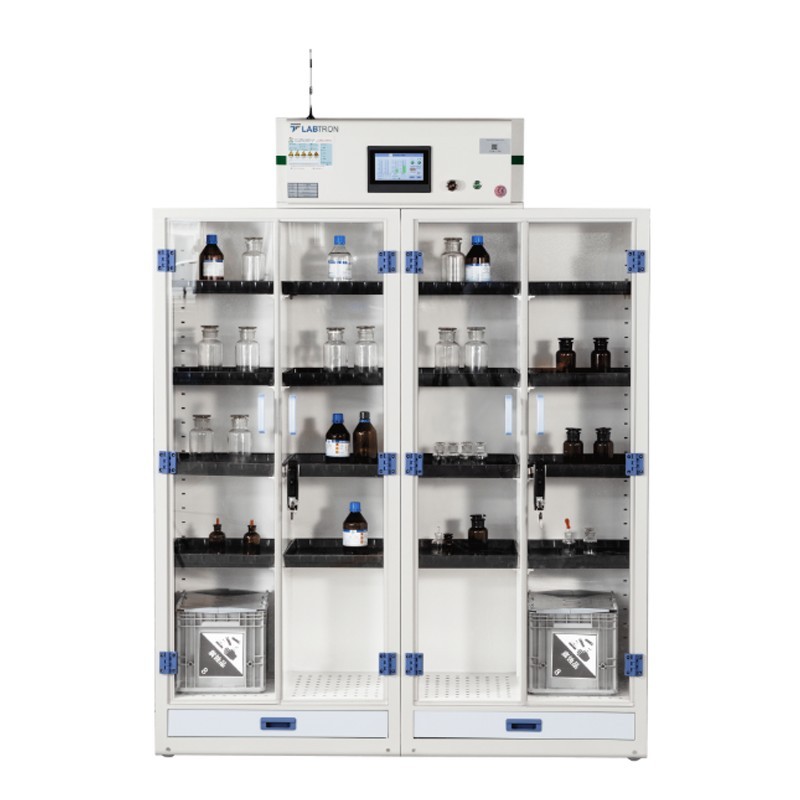 Filtered Chemical Storage Cabinet LFCS-A11 is a ductless, floor-standing storage cabinet. It enables fast purification of air within 24 hours, minimizing health hazards. Designed with adjustable shelves and large PP drawers, it provides convenient storage for chemicals. The cabinet releases purified air back into the room, free of any toxic hazardous vapors, making it an ideal solution for every laboratory, offering protection from the toxic vapors and noxious odors of harmful chemicals. Its anticorrosive, transparent acrylic door with a large touch screen display offers safety monitoring and makes the handling of hazardous chemicals easier.