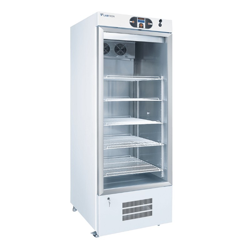 Pharmacy Refrigerator LPRF-A11 is a digital microprocessor-controlled temperature refrigerator with a holding capacity of 350 liters. It features an automatic defrost system, a digital thermometer thermostat, and a chromium-nickel 304 internal surface coating for durability. The unit operates with a full-range temperature system, maintaining temperatures between 2 to 8°C, and includes five wire storage shelves for organizing products. A double glass door allows for easy observation, and the unit is equipped with audible and visual high/low temperature alarms for safety. It also includes a 24-hour active battery with a power shutdown signal alarm and an internal illumination light source for visibility. The refrigerator operates quietly and is user-friendly, making it ideal for various laboratory and pharmaceutical applications.