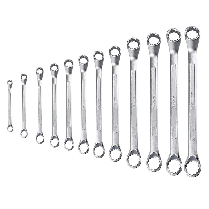 The Shallow Offset Bi-hex Ring Spanner, made from Chrome Vanadium (CrV) steel, features an offset head for easy access to fasteners in tight spaces. The bi-hex design allows for a secure grip on both six-sided and twelve-sided nuts. Durable and corrosion-resistant, this spanner is ideal for automotive and mechanical tasks.