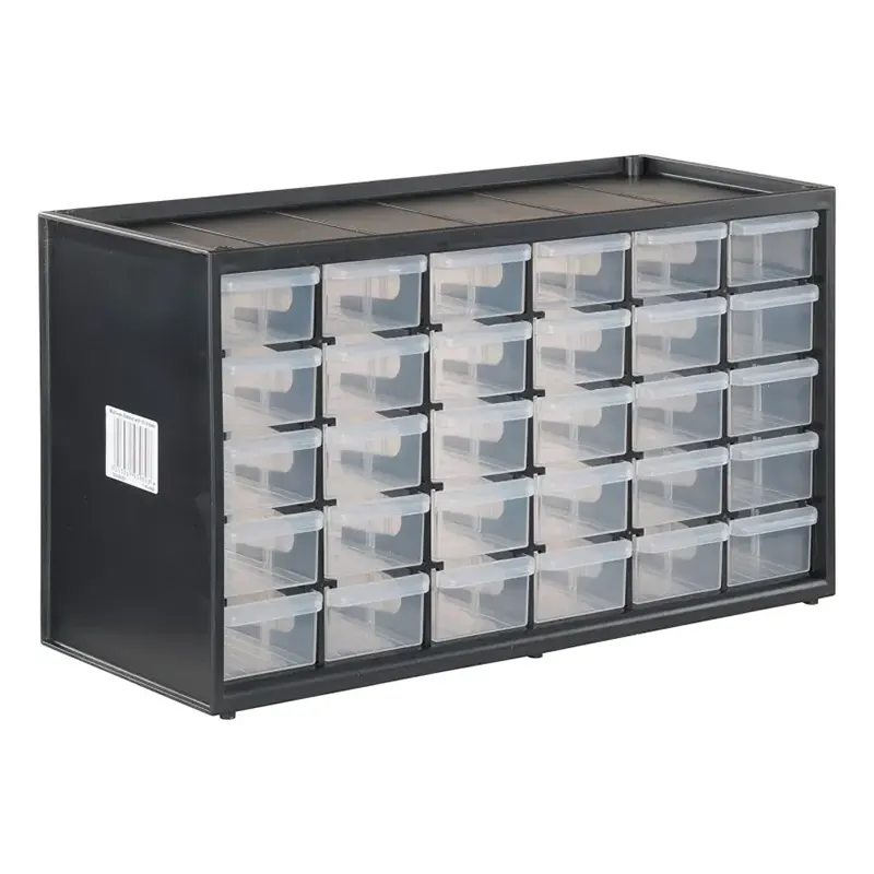 The Storage Box 30 Bin System offers an efficient way to store and organize small parts and tools. With 30 individual bins, this system allows for quick access to screws, nails, and other small items. The durable construction ensures that it can withstand heavy use, while the transparent bins provide visibility of contents. Ideal for home workshops, garages, and industrial environments, this system helps keep your workspace organized and clutter-free.