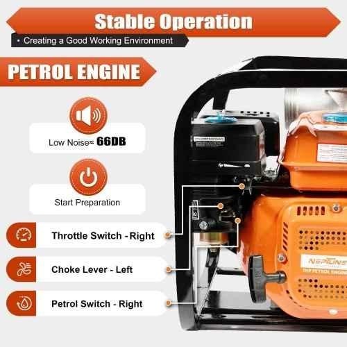 Neptune 7HP 4 Stroke 196CC Petrol Water Pump Set, model NPP-30 Pro, offers robust performance for agricultural water management. It runs at a high speed of 3600 rpm, capable of lifting water to a height of 92 feet. The 4-stroke engine design ensures fuel efficiency and reduced maintenance compared to 2-stroke alternatives. A 3L fuel tank supports prolonged operation without interruption. This pump is housed in a durable frame, making it resistant to outdoor elements and ideal for irrigation, water transfer, or drainage operations in farms.