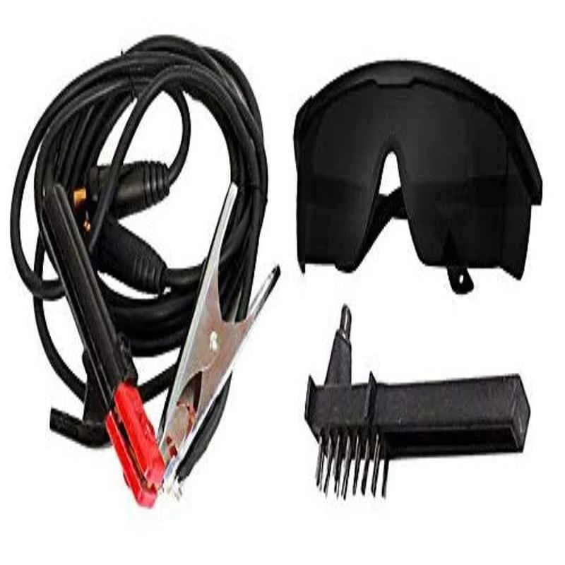 Package Contents: Electrode Cable, Earth Cable, Clamps, Goggles with Wire Brush