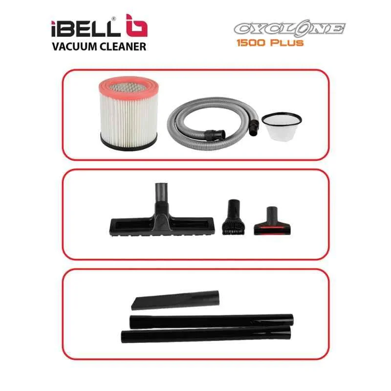 The iBELL Cyclone 1500 Plus is an industrial-grade wet and dry vacuum cleaner with a 30-liter stainless steel tank and 1550W motor. Delivering 21kPa of suction power, it’s built for powerful cleaning of both wet spills and dry debris. A HEPA filter ensures fine particle filtration, promoting cleaner air. With a noise level under 80 dBA and sturdy construction, it's ideal for industrial, commercial, and heavy-duty home use.