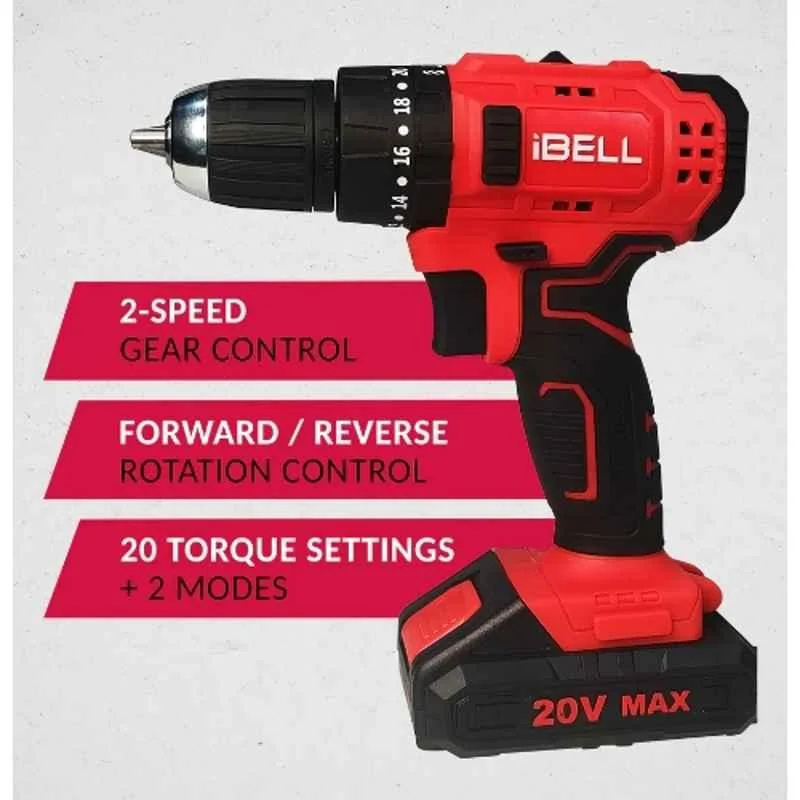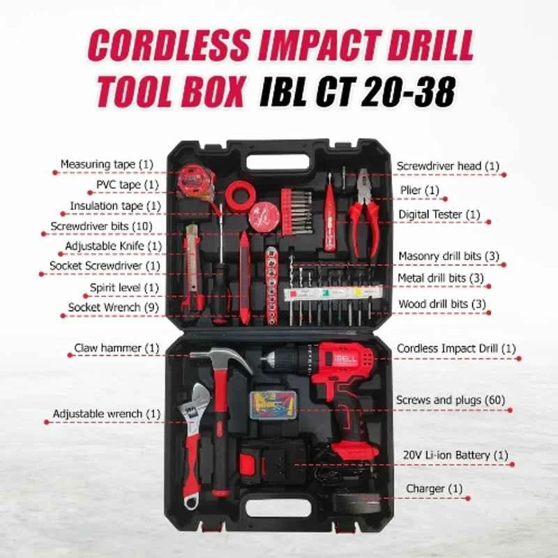 The iBELL CT20-38 cordless impact drill is built for power and convenience. With a speed range of 0–1450 rpm and 38Nm torque, it's perfect for wood drilling (up to 15mm). Powered by a 20V 1500mAh Li-ion battery, it offers long runtimes and high efficiency. The drill comes in a sturdy toolbox for portability and storage, making it ideal for both DIY and professional users. Enjoy cordless freedom and strong performance in one package.