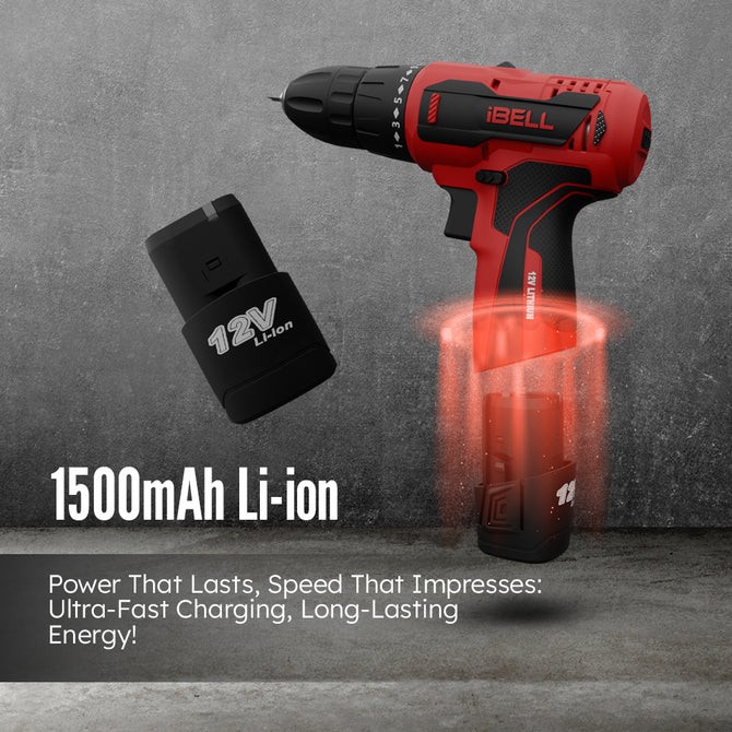 The iBELL CD12-74 12V Cordless Driver Drill is a compact and powerful tool suited for DIY and professional use. It comes with a 1500mAh Li-ion battery, 1 charger, 2 batteries, and 32 accessories. The drill features dual speed (0-350/0-1400 rpm) and 28Nm torque, making it effective for drilling and screwdriving. It charges in 3–5 hours and includes a reverse function. The ergonomic design, handy belt clip, and red color enhance usability. Backed by a 6-month warranty, it’s a practical tool for versatile tasks.
