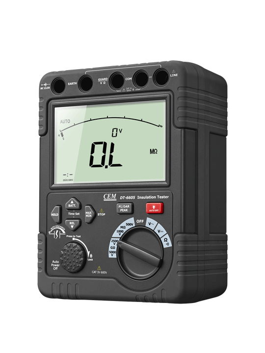 CEM Digital High Voltage Insulation Tester DT-6605 is a high-performance insulation resistance meter for testing transformers, motors, and power cables. It offers multiple test voltages, a large backlit display, and superior accuracy. Built with industrial durability, it ensures long-term performance even under tough conditions. Essential for preventive maintenance, this insulation tester guarantees electrical safety, system reliability, and compliance with global insulation standards.