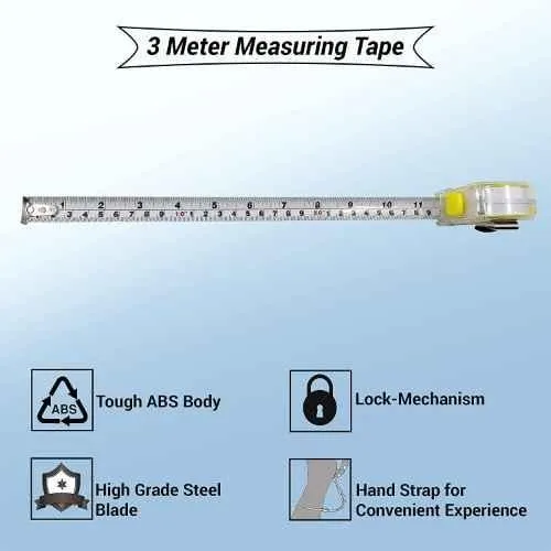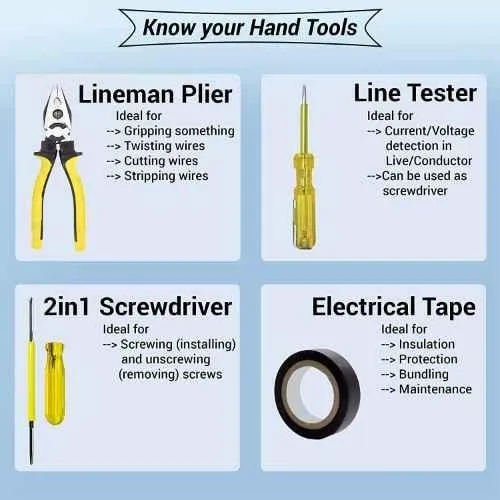 Package Contents: 1 Pc Plier / 1 Pc Claw Hammer / 1 Pc 2 Pcs in 1 Pc Screwdriver / 1 Pc Wire Cutter / 1 Pc Measuring Tape / 1 Pc Line Tester / 1 Pc Electrical Tape & 1 Pc Utility Knife