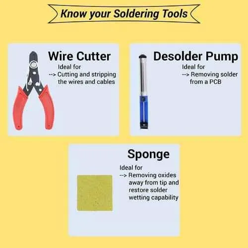 Package Contents: 25W Soldering Iron / 5 Meter Soldering Wire / Soldering Paste / Soldering Iron Stand / Wire Cutter / Tweezer / Desoldering Wick / Line Tester / Electrical Tape / ESD Brush / Desoldering Pump & Sponge