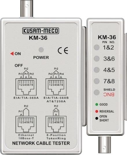 The Kusam Meco KM36 Network Cable Tester is designed for accurate continuity and connection testing of RJ11 and RJ45 cables. It detects open circuits, shorts, and mis-wiring quickly and efficiently. Lightweight and easy to use, it’s an essential diagnostic tool for network installation and maintenance professionals ensuring reliable cable connectivity.