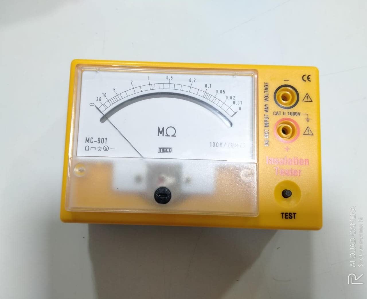 The Meco MC-900 is an analog insulation tester designed for evaluating insulation resistance in electrical systems, cables, transformers, and machines. With selectable test voltages up to 1000V, it provides clear and reliable analog readings, making it ideal for field engineers who prefer visual analog scales. The durable, portable design and mechanical stability make it suitable for routine preventive maintenance, installation verification, and quality inspections across electrical plants, workshops, and substations.