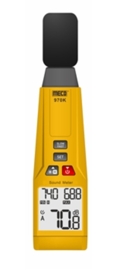 The Meco 970K is a professional-grade sound level meter for measuring noise in residential, commercial, and industrial settings. It offers fast/slow response modes and A-weighting, with readings displayed on a digital LCD screen. Suitable for sound system testing, factory noise monitoring, and environmental assessments, the 970K includes data hold, auto-ranging, and overload indication. Its compact build and robust design make it ideal for daily noise inspection work.