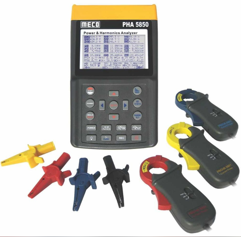 The Meco PHA-5850A is a sophisticated power and harmonics analyzer designed for advanced monitoring and analysis of electrical systems. It measures three-phase power parameters, voltage, current, energy consumption, and detailed harmonic data. With a color display, data logging, and real-time waveform analysis, it supports preventive maintenance and fault diagnosis in substations, manufacturing plants, and commercial buildings. It provides graphical representation of harmonics and supports USB/PC connectivity, ensuring comprehensive power quality assessments for engineers and auditors.