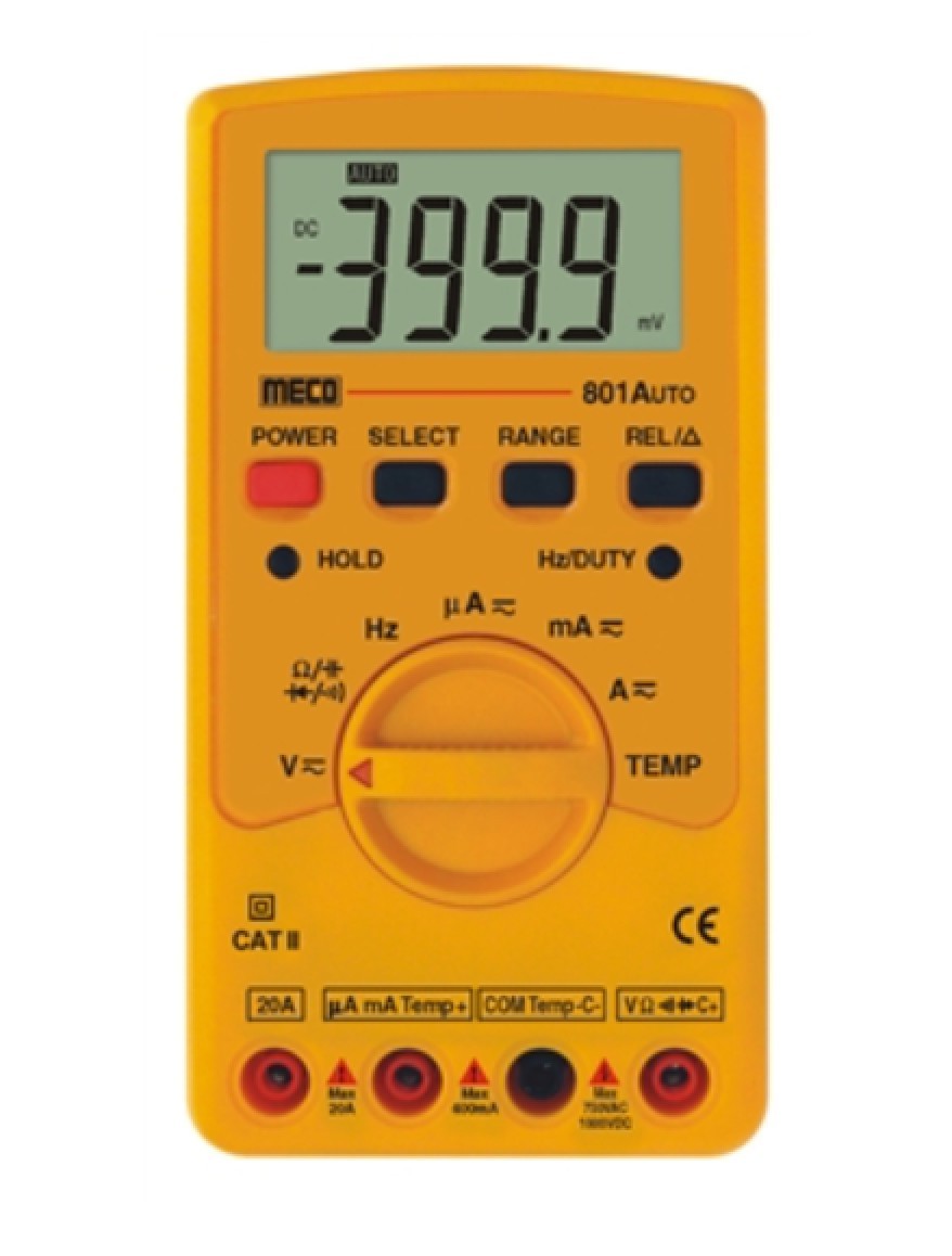 The Meco 801 Digital Multimeter features auto‑ranging across voltage, current, resistance and continuity tests, eliminating the need for manual range selection. Built with safety rated insulation, data‑hold function and a large clear display, it is well suited for fieldwork, electronics servicing and general purpose diagnostics. Providing a balance between ease of use and accuracy, the 801 model facilitates quick measurement tasks by technicians, maintenance teams and electronics enthusiasts seeking a practical and ergonomic digital measurement tool with smart features and reliable durability.