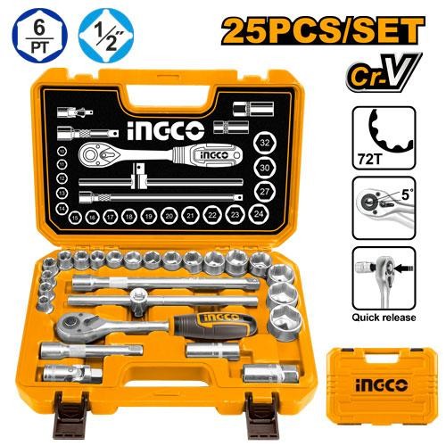 The Ingco 25 Pcs CR-V Socket Set, HKTS12251, is a versatile and durable toolset designed for both DIY enthusiasts and professionals. Made from high-quality Chrome Vanadium (CR-V) steel, these sockets offer exceptional strength and longevity. The set includes a range of 25 sockets to handle various tasks with ease, while the polished finish ensures corrosion resistance. This socket set includes 1 Pc 1/2 inch Dr Ratchet wrench, 45T, providing smooth performance. Stored in a durable carrying case for easy transport, this set ensures convenience and organization, making it an essential addition to your toolkit.