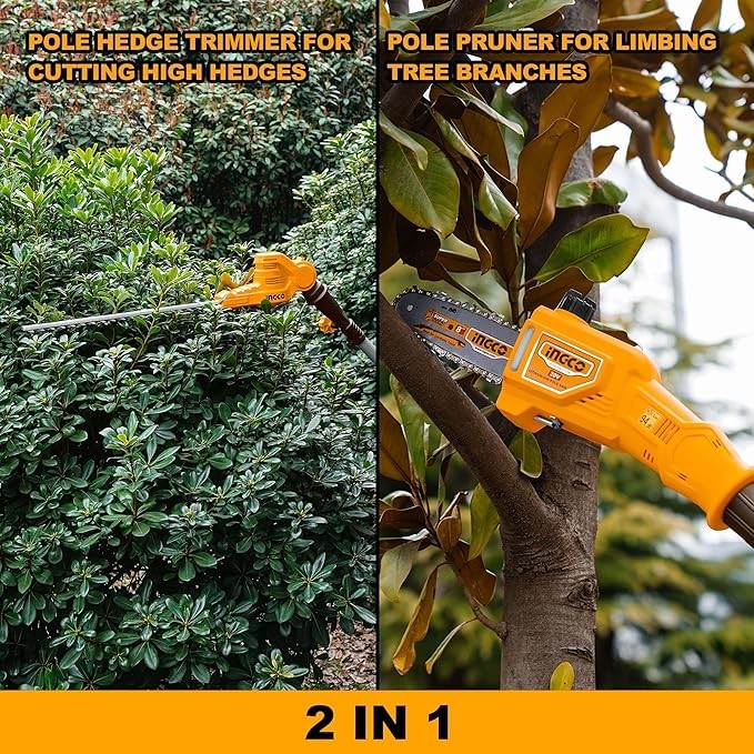 The Ingco 20V Lithium-Ion Pole Saw Hedge Trimmer offers versatile trimming for trees and hedges. Powered by a 20V lithium-ion battery, it ensures long-lasting performance and consistent power for all your trimming needs. This cordless trimmer provides freedom of movement, making it easier to reach every corner of your garden. With Ingco’s reputation for durability and quality, this trimmer is built to last. Ideal for both professionals and DIY enthusiasts, it’s the perfect tool for maintaining your garden with ease and precision.