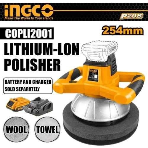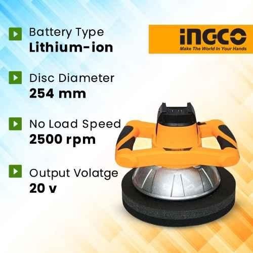 The Ingco 20V Lithium-Ion Polisher (COPLI2001) features a 254mm polishing disc for efficient and professional-grade results. With its powerful 20V battery, this polisher offers cordless convenience and mobility, perfect for polishing cars, furniture, or countertops. The variable speed control ensures precision for different materials and finishes. Its ergonomic design reduces fatigue during extended use, while the large disc covers more area in less time. Experience smooth, flawless surfaces with this versatile, durable polisher from Ingco.