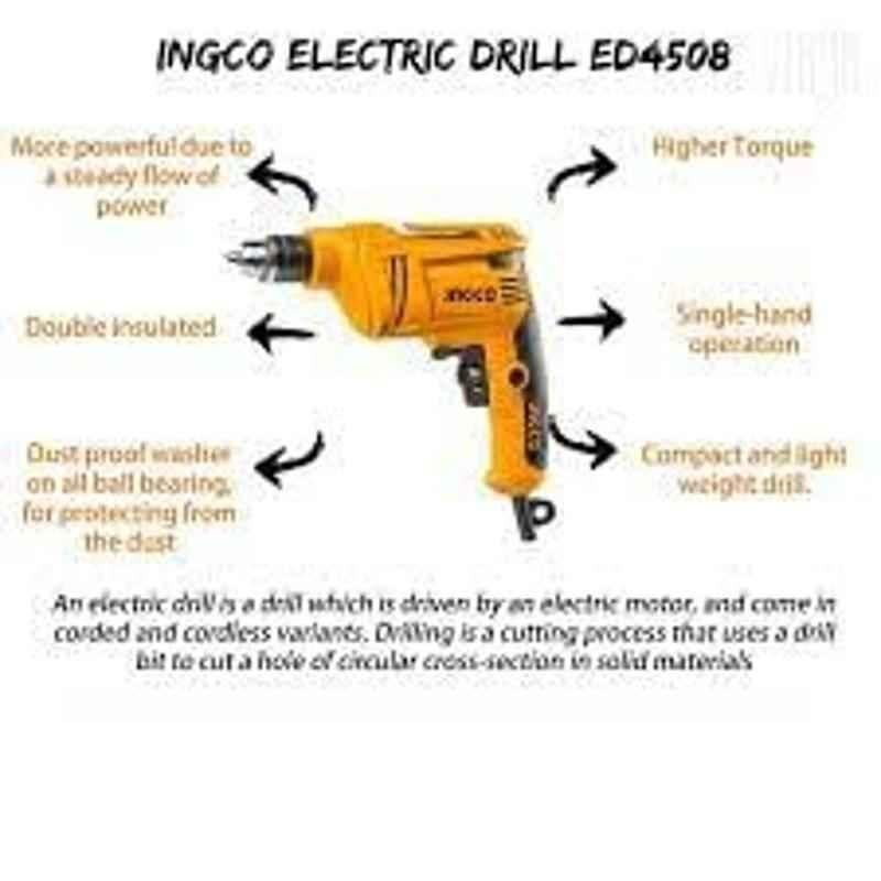The Ingco 450W Electric Drill, ED4508, is a versatile and powerful tool designed for various tasks. Its 450W motor ensures smooth operation, making it perfect for drilling, chiseling, and hammering through tough materials such as concrete, masonry walls, and more. With a no-load speed of up to 4300 rpm, this drill can tackle even the hardest surfaces with ease. Ergonomically designed for comfort, it provides excellent control, ensuring accuracy in every job. Whether you’re a professional or a DIY enthusiast, the Ingco Electric Drill is ideal for a wide range of applications. Its reliability and performance make it a must-have tool for your toolbox.