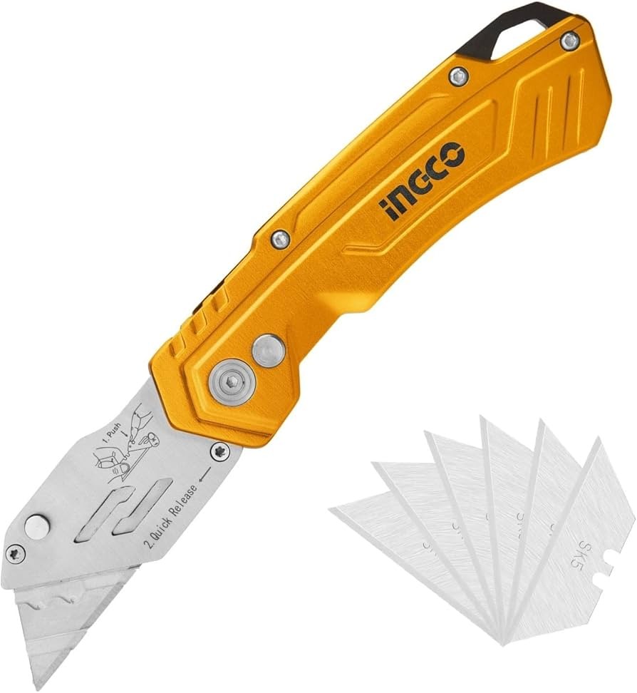The Ingco HUK6288 Folding Knife is a high-precision cutting tool ideal for professional and home use. Featuring a stainless steel blade and ergonomic handle, it ensures reliable performance and comfort. This set includes 6 additional metal cutter blades, making it ideal for slicing cardboard, plastic, leather, and more. The compact foldable design provides safety and portability, allowing it to fit easily into pockets or toolboxes. Perfect for utility work, packaging, or general DIY applications.