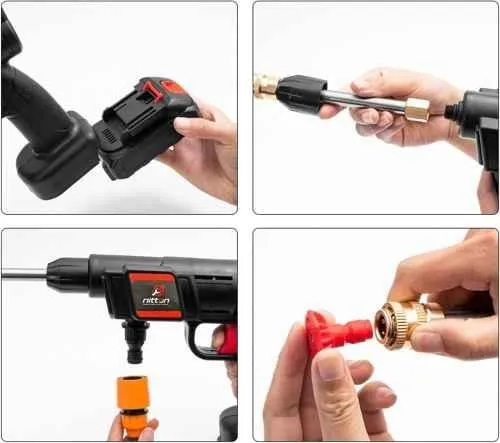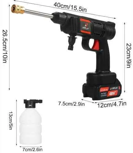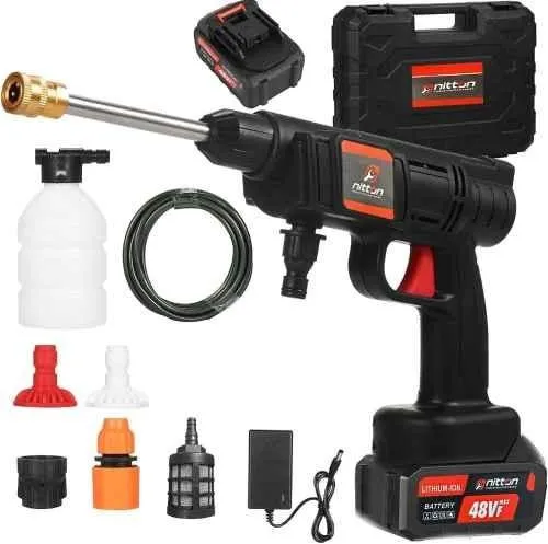 The MECRAAF 48V Cordless High Pressure Washer Gun is the perfect tool for fast, efficient car and bike washing. With a maximum pressure of 725 PSI and a flow rate of 3lpm, this portable washer ensures powerful performance while maintaining portability. The washer comes with an adjustable nozzle and three spray modes, allowing versatility for different cleaning tasks. Its compact and lightweight design makes it easy to use and store, ideal for any cleaning job without the hassle of cords. Package Contents : 1 Pc Car Washer, 1 Pc Long Rod Nozzle, 1 Pc Foam Bottle, 2 Pcs Lithium Battery, 1 Pc Power Adapter, 1 Pc Hose, 1 Pc Water Inlet Quick Connector, 1 Pc Filter, 2 Nozzles with Manual