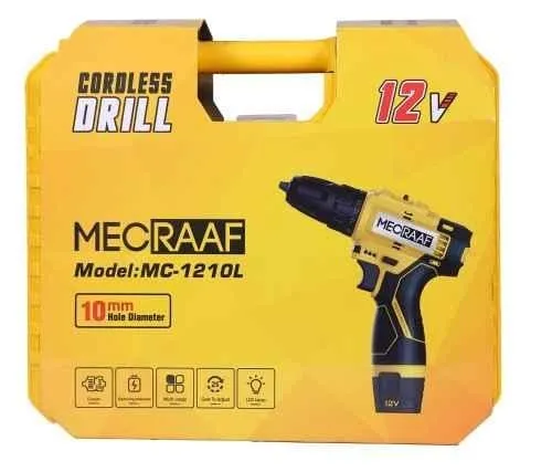 The MECRAAF 12V Cordless Screwdriver (Model MC-2110) offers powerful performance for all your drilling and screwing needs. With a 0-1300 rpm no-load speed, it’s ideal for a wide range of tasks. Featuring a reversible switch and a multi-torque clutch, you can control the force for precise operation. The 10mm chuck size ensures compatibility with a variety of bits, while the Li-ion battery ensures long-lasting performance. This tool comes with two batteries, a charger, and a convenient tool kit box for easy storage. Package Contents : 1 Pc Cordless Drill, 2 Batteries, 1 Pc Charger & Tool Kit Box