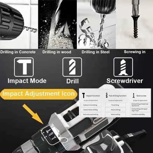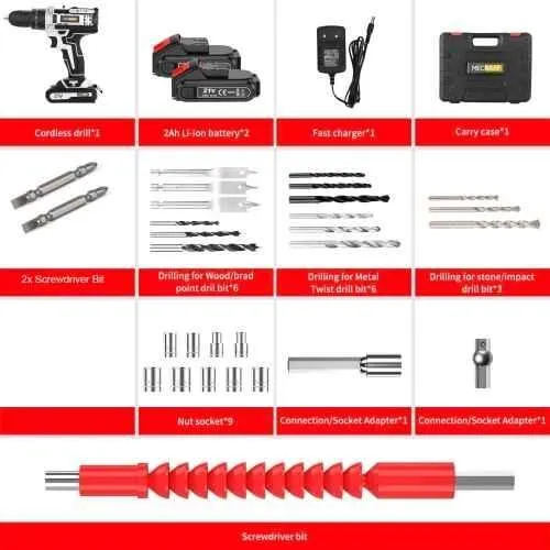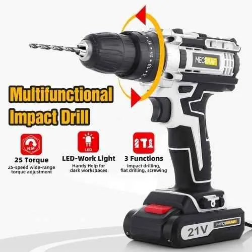 The MECRAAF 21V 1.5Ah 0.8-10mm Grey Cordless Drill is perfect for various drilling applications. It features a no-load speed range of 0-450 and 1650 rpm, providing you with the flexibility to adjust the speed for different tasks. The 1.5Ah battery ensures reliable power, while the 20+3 torque settings give you precise control for all your drilling needs. The built-in LED work light illuminates dark areas, making it ideal for use in poorly lit spaces. This drill combines power and convenience for your DIY projects. Package Contents : 1 Pc Cordless Drill, 2 Pcs 21 V Lithium-Ion Battery, 1 Pc Charger, 1 Pc Tool Kit Box, 6 Pcs Drill Bits for Wood, 6 Pcs Drill Bits for Metal, 2 Pcs Screwdriver Bits, 1 Pc Flexible Shaft Driver, 9 Pcs Socket Wrench & 2 Pcs Socket Adapters