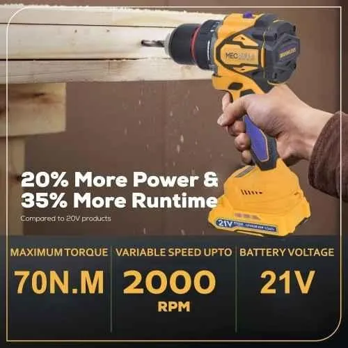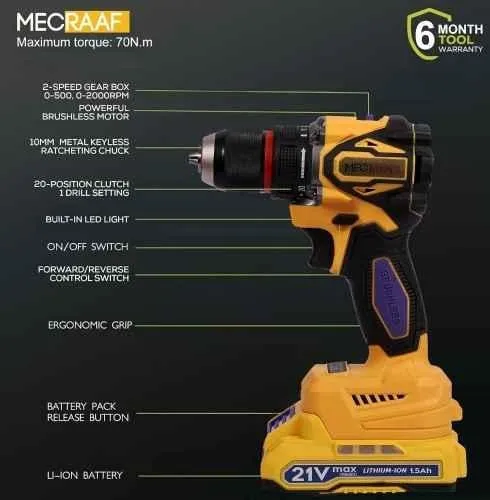 The MECRAAF 21V 1.5Ah 10mm Yellow Cordless Drill offers convenience and power for all your drilling needs. With a no-load speed range of 0-500 and 2000 rpm, it is suitable for various materials. The 10mm chuck allows for a wide range of drill bits, and the 25+1 torque settings ensure precise control. The LED work light is perfect for dark environments, while the lithium-ion battery ensures quick charging and longer battery life. Ideal for both DIY enthusiasts and professionals, this drill is designed to provide maximum efficiency. Package Contents : 1 Pc Brushless Drill, 1 Pc Fast Charger, 2 Pcs 21V Battery & 1 Pc Equipment Carry Case