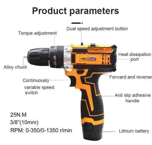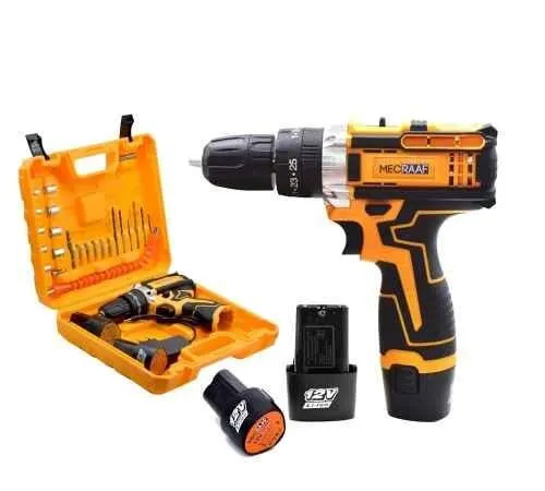 The MECRAAF 12V 1.5Ah 10mm Yellow Cordless Drill provides power and efficiency for all your drilling needs. With a no-load speed of 0-350 & 1350 rpm, it offers versatility for both light and heavy-duty tasks. The drill features a 10mm chuck size, 25+3 torque settings, and two-speed options for enhanced control. The integrated LED work light illuminates your workspace, while the lithium-ion battery ensures quick charging and longer use. Perfect for both professionals and DIYers, this drill is a reliable tool for all projects. Package Contents : 9 Pcs 4-12 mm Socket Bit Holder, 1 Pc Screwdriver Bits (PZ1, PH1, PH2, T20, Sl5, Sl6), 1 Pc Extension Bit Holder, 1 Pc Wood Drill, 3 Pcs Hess Drills, 3 Pcs Flexible Screwdriver Attachments, 1 Pc Cordless Drill Machine, 1 Pc 12V Battery, 2 Pcs Chargers & 1 Pc Blow Mould Case