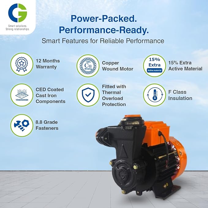 The cast iron body and forged brass impeller guarantee superior durability and resistance to corrosion, even under demanding conditions. The stainless steel shaft and SS 410 material grade make maintenance minimal and reliability maximum. The pump handles a head range of 6–22 meters, making it ideal for filling overhead tanks, garden irrigation, and general water transfer between locations.
