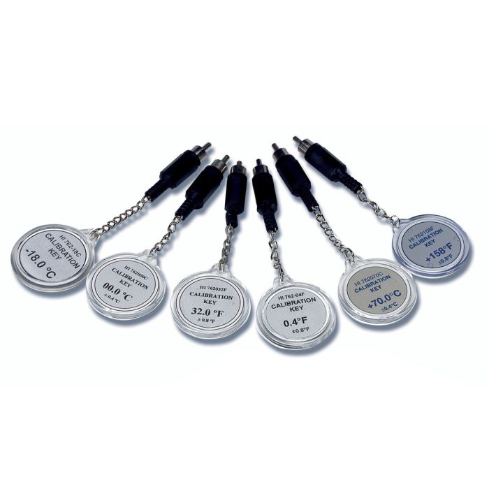 Hanna Instruments HI762-18C Calibration Check Key is a specialized accessory designed for quick and accurate verification of thermistor thermometers that use HI762 series probes. This check key simulates a precisely rated value of -18°C (±0.4°C), allowing users to confirm thermometer accuracy before laboratory or industrial measurements.