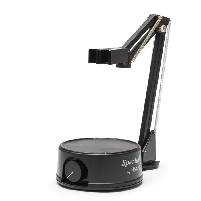 Hanna HI181-2 Compact Magnetic Mini-Stirrer with Electrode Holder is designed for precise laboratory mixing and sample preparation. This lightweight and compact instrument features an integrated adjustable electrode arm that securely holds up to three electrodes, each with a diameter of 12 mm or less. The robust, black ABS plastic construction ensures durability for everyday laboratory use.