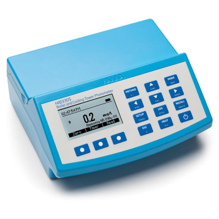The HI83305 Multiparameter Boiler and Cooling Tower Photometer is a compact and advanced laboratory instrument designed for precise water analysis in industrial, HVAC, water treatment, and laboratory environments. With 30 programmed methods and the ability to measure 18 key water quality parameters, it is ideal for both laboratory and field applications, specifically addressing the needs of boiler and cooling tower monitoring.