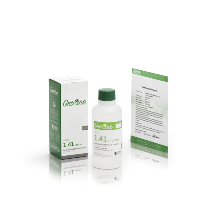 Hanna HI7031-023 GroLine 1413 µS/cm Conductivity Standard is a premium calibration solution prepared against NIST traceable standards, supplied in a 230 mL bottle with Certificate of Analysis.