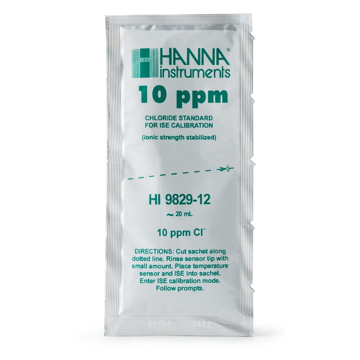 HI9829-12 10 ppm Chloride Calibration Standard Sachets for HI9829 are designed for precise calibration of laboratory ion-selective electrodes. Each set includes 25 sachets of 25 mL premium-grade standard solution.