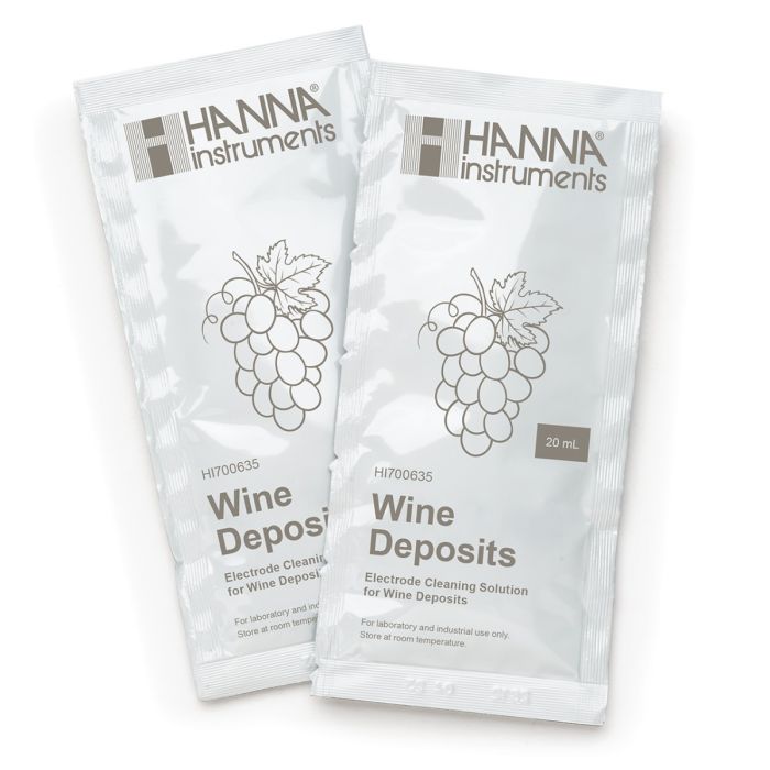 HI700635P Cleaning Solution for Wine Deposits is a specialized pH electrode cleaning solution supplied in 25 x 20 mL sachets for removing wine juice and must deposits from pH electrodes.