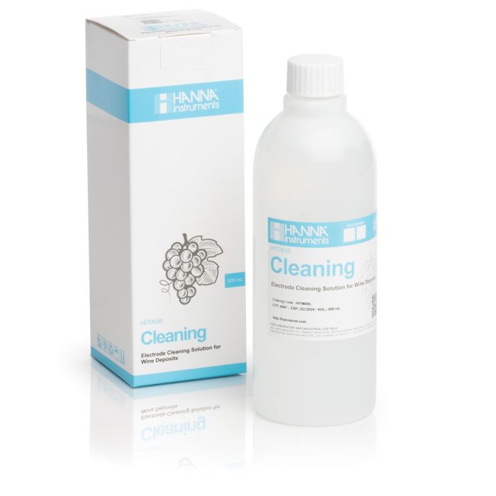 Hanna HI70635L Cleaning Solution for Wine Deposits is a 500 mL bottle designed specifically for removing wine juice and must deposits from pH electrodes.