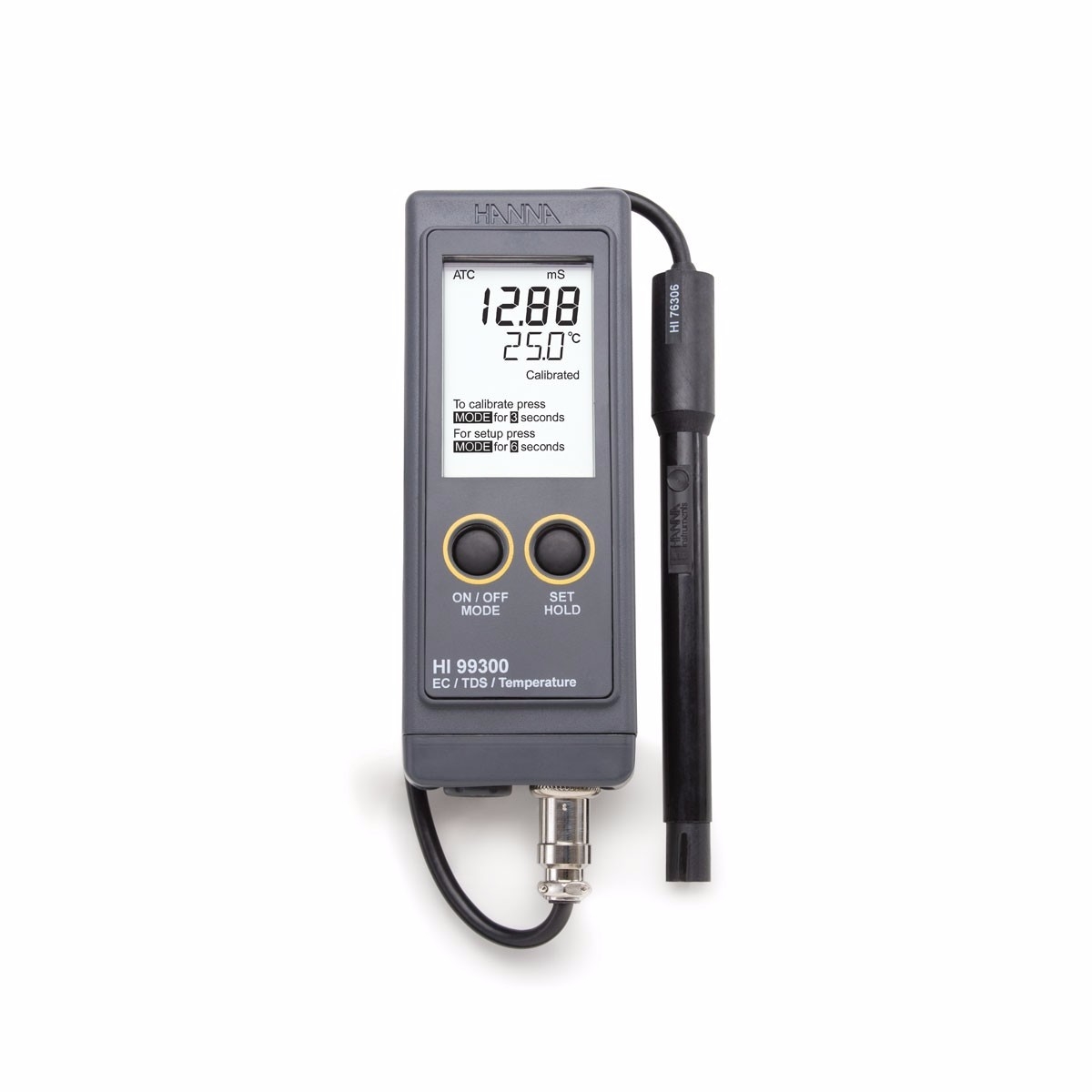 Featuring Automatic Temperature Compensation and a selectable EC to TDS conversion factor (0.45–1.00), the HI99300P ensures measurement precision under fluctuating temperature conditions. It is equipped with a HI76306 two-ring probe with an integrated temperature sensor and a robust DIN connector, paired with a 1 m cable for practical field use. The device allows users to easily perform one-point automatic calibration for both EC and TDS measurements.